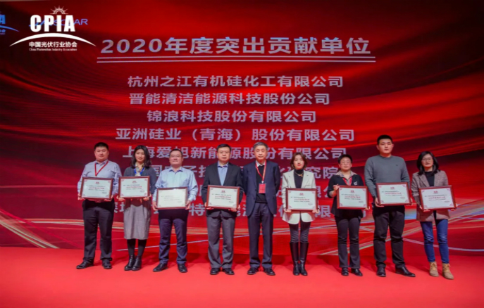 為感謝2020年度在協(xié)會(huì)各項(xiàng)會(huì)議活動(dòng)、標(biāo)準(zhǔn)及戶用工作等方面,做出突出貢獻(xiàn)的會(huì)員單位,在2020年中國(guó)光伏行業(yè)年度大會(huì)期間,特授予天合光能股份有限公司、晶澳太陽(yáng)能科技股份有限公司、晶科能源有限公司、陽(yáng)光電源股份有限公司、浙江正泰新能源開(kāi)發(fā)有限公司、隆基綠能科技股份有限公司、華為技術(shù)有限公司、錦州陽(yáng)光能源有限公司、通威股份有限公司、杭州之江有機(jī)硅化工有限公司、晉能清潔能源科技股份公司、錦浪科技股份有限公司、亞洲硅業(yè)(青海)股份有限公司、上海愛(ài)旭新能源股份有限公司、蘇州賽伍應(yīng)用技術(shù)股份有限公司、深圳古瑞瓦特新能源股份有限公司、中國(guó)電子技術(shù)標(biāo)準(zhǔn)化研究院17家單位“2020年度突出貢獻(xiàn)獎(jiǎng)”。