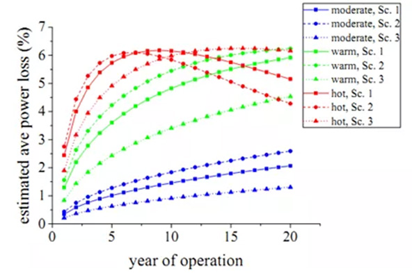 結(jié)果如圖所示,在炎熱地帶,年發(fā)電損失約達到5%,當達到最大衰減以后,第7年以后組件在熱輔助的作用下開始功率恢復(fù),但是恢復(fù)的程度有限,需要花費的時間也很長,如圖則需要10年以上。在溫暖地區(qū),第5年功率衰減達到4%左右。在中性氣候地區(qū),影響較小。